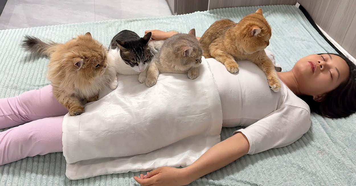 ある日、ベッドで横になっている飼い主さんの姿を見つけた猫達。早速みんなで起こそうとしますが、反応が全く無かったため、死んでしまったのではないかと心配し始めました。