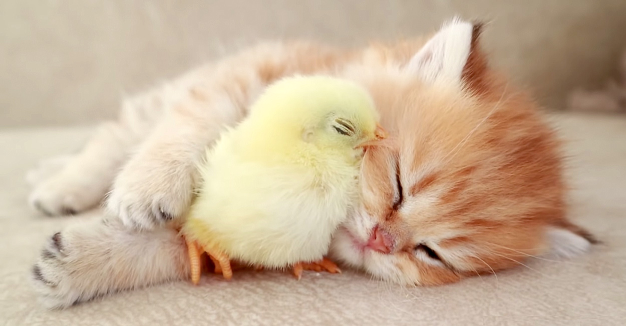 ある日、お気に入りのソファーの上でお昼寝を始めたブリティッシュショートヘアの子猫。どうやら一緒に遊んでいたヒヨコも眠たくなってきたようで、子猫の腕の中でウトウトし始めました♪