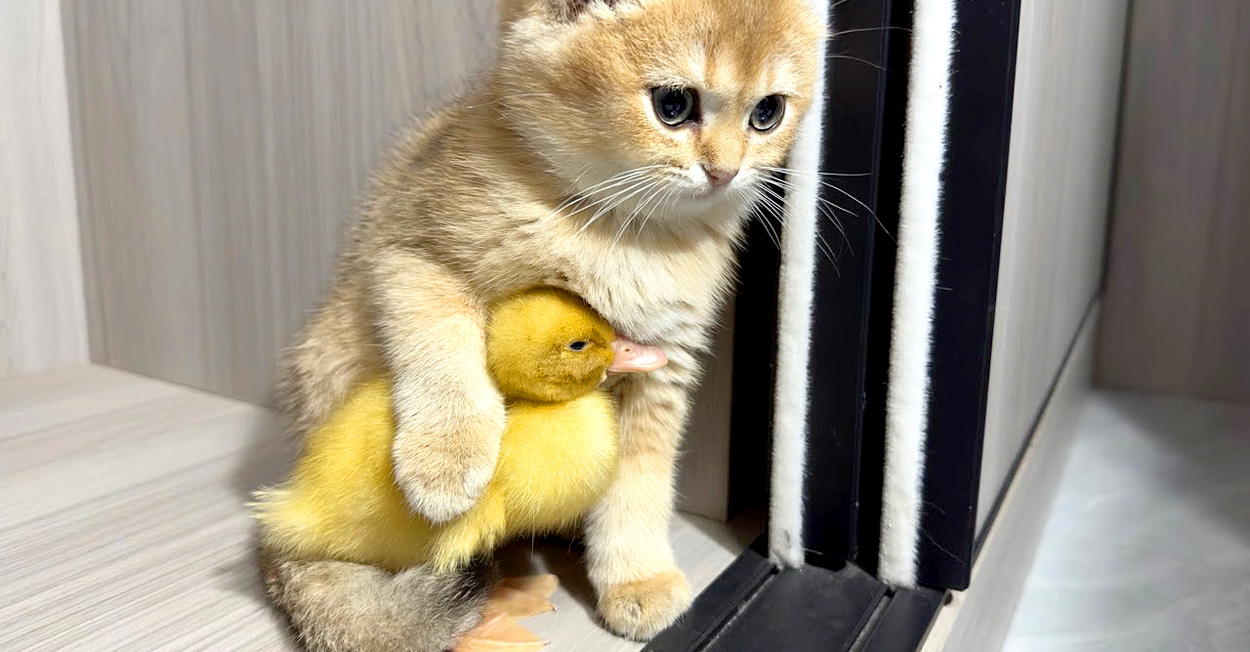 同じ屋根の下で暮らしている子猫とアヒルのヒナ。どうやらヒナは子猫のことをお母さんのように思っているようで、子猫の後をどこまでもついて行きます。
