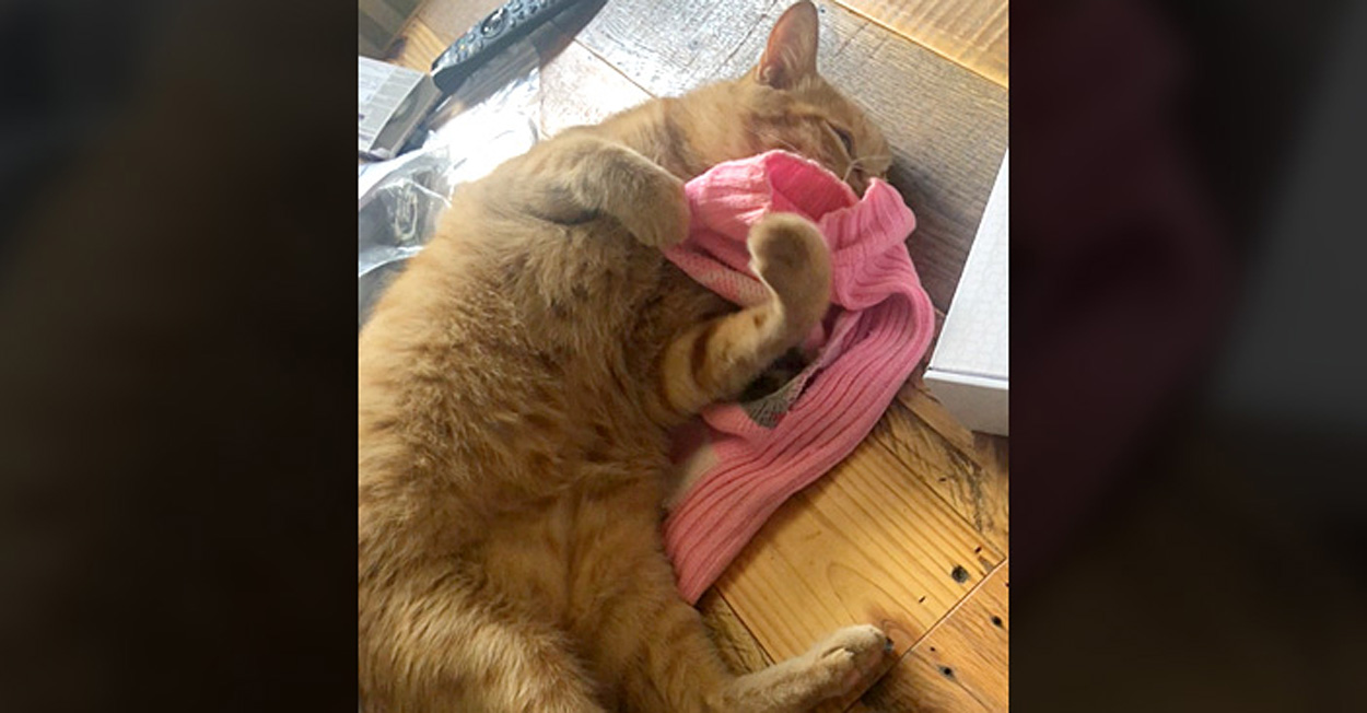 それから数ヶ月後、猫は同居犬がいつも着ていたセーターを見つけました。すると懐かしい匂いを感じたのか、普段見せることのない反応を示しました。