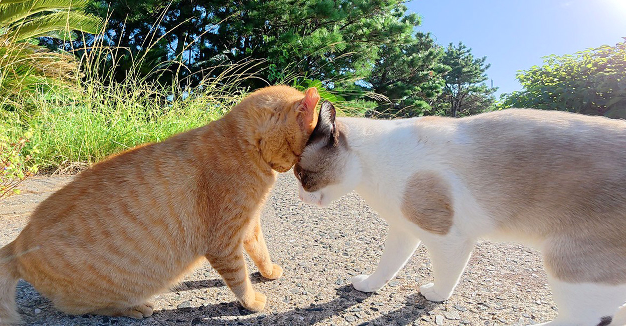 タヌキみたいな猫が通りがかった茶トラ猫に突然喧嘩を売る! 予想外の出来事に茶トラ猫は思わず困惑!