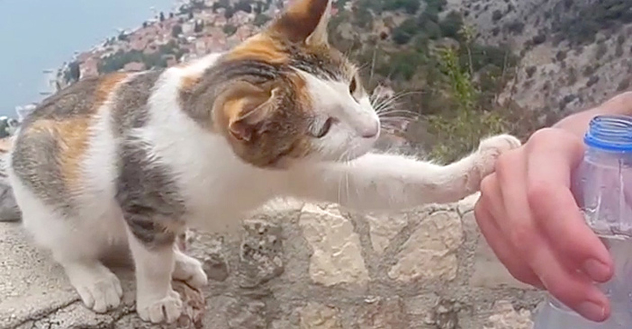 どうやら猫は喉が渇いていたようで、ペットボトルを持ち歩いていたデニスさんに向かって、「ねぇ、そのお水ちょうだい」と言っているかのように手を掴んでおねだりしてきました。