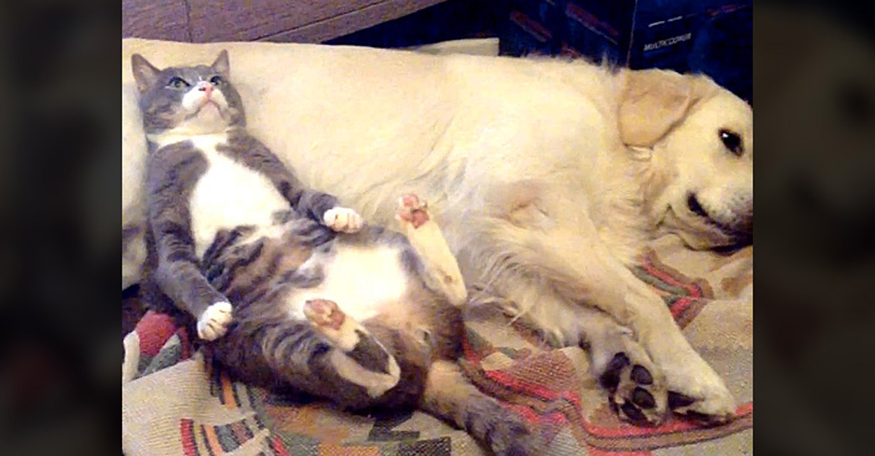 お昼寝中の犬のお腹をこっそりと枕にしていた猫。そんな猫に犬が気づくと、まるでコントのような展開に ( *´艸`)