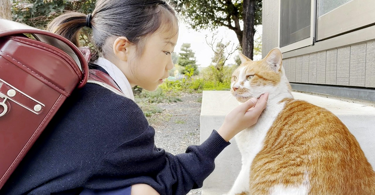 学校から帰ったら必ず庭猫に挨拶する女の子。どうやら庭猫の方も心待ちにしているようで、とっても可愛い反応が♡