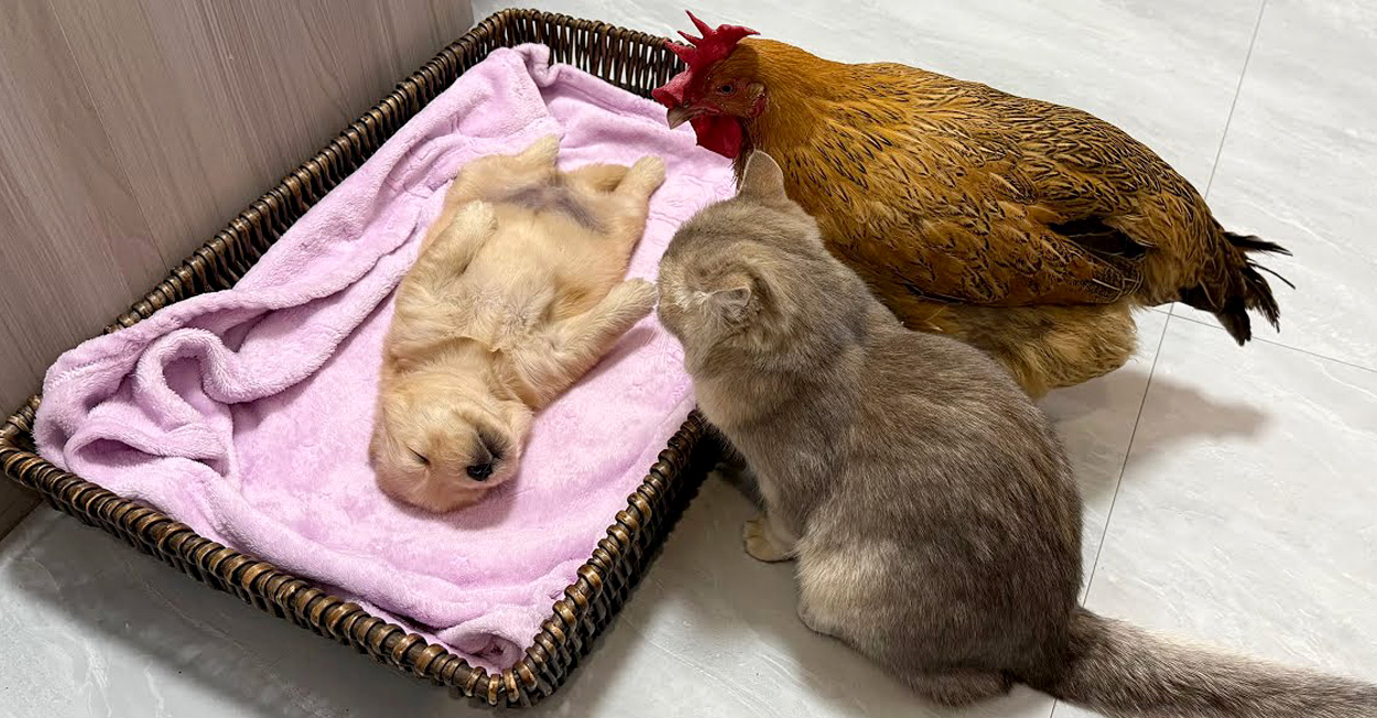 ある日、保護されたゴールデンレトリバーの子犬がバスケットの中で眠っていました。するとそこにやって来たニワトリが、ひっくり返っている子犬の姿を見て死んでしまったのではないかと心配しました。