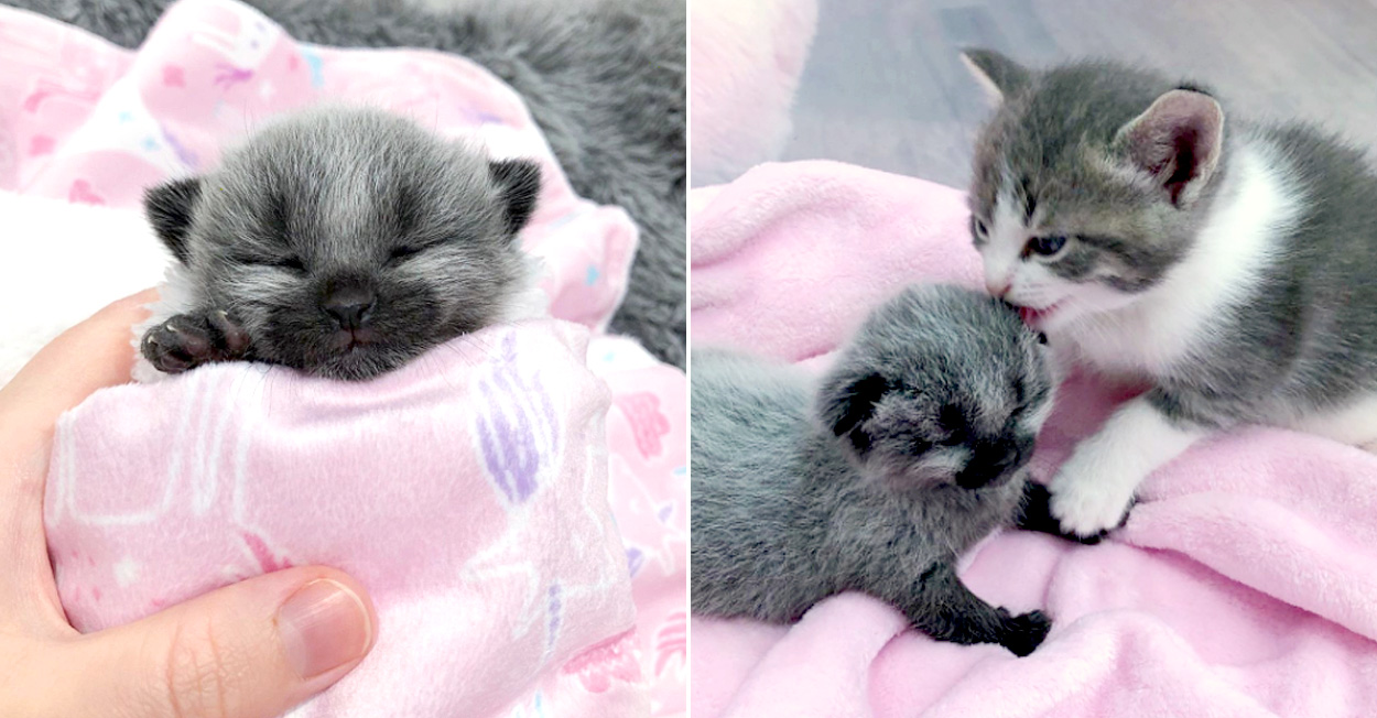 同じ月の終わり頃、メリッサさんは衰弱した状態で歩道で発見された、独りぼっちの子猫についての連絡を受けました。子猫はとても体が小さく、体重は僅か82gしかありませんでした。そんな状況だったにもかかわらず、子猫は生きたいという強い意志で何とか命を繋いでいました。