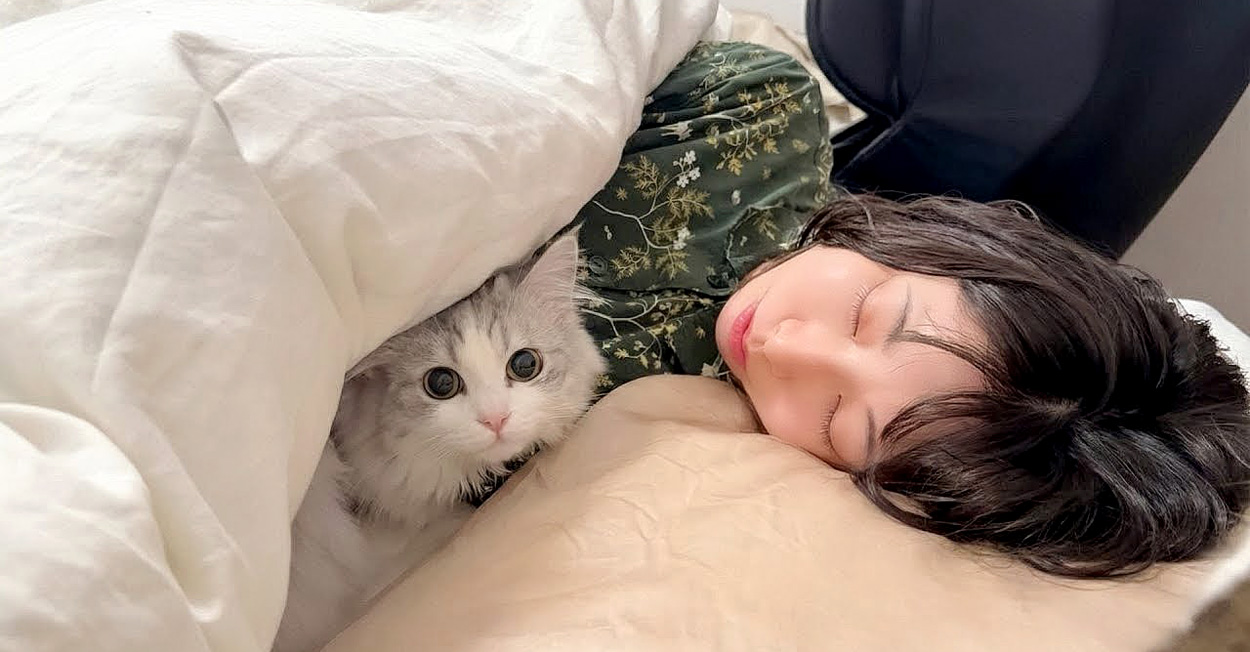 疲れて眠るママの布団にコッソリと忍び込んで添い寝する子猫。甘えん坊が止まらなくて、とっても可愛いことに♡