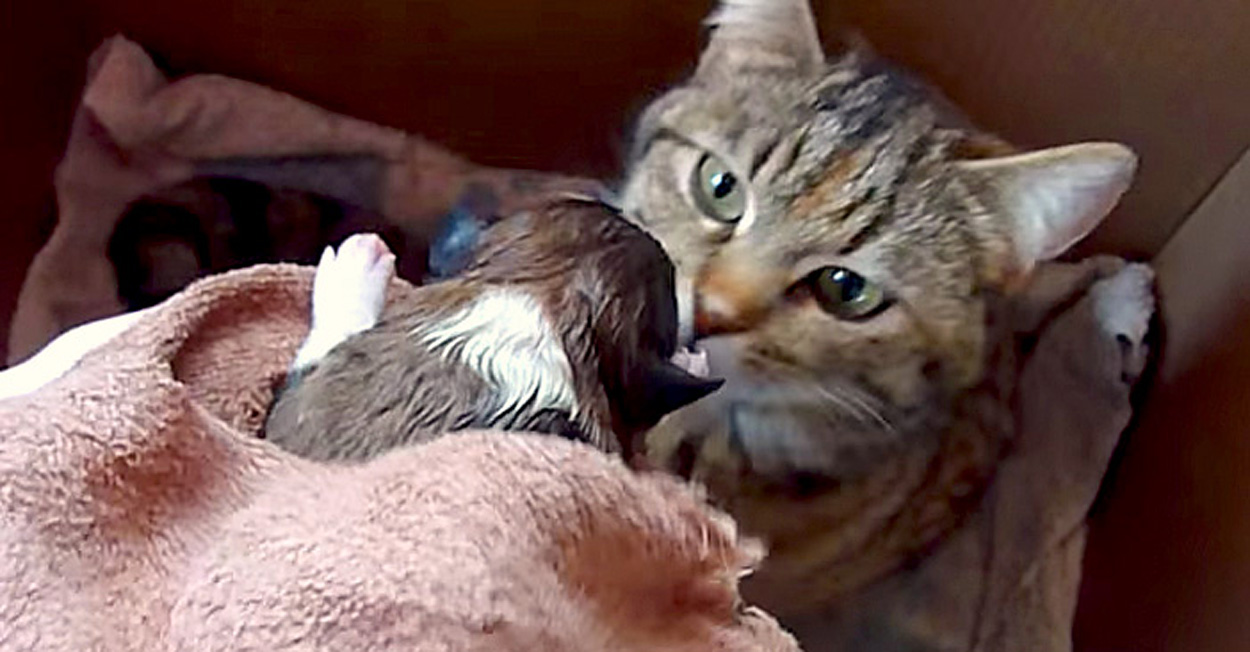 愛情深い母猫の行動に心が温まりますね。きっと幼い子犬は優しい母猫にたくさんの愛情を注がれながら、愛情深い犬へと成長していくことでしょう(*´ェ`*)