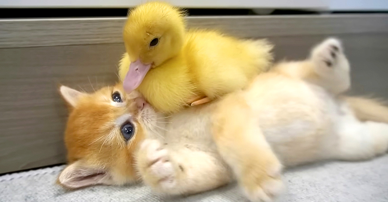 一緒に暮らし始めたアヒルのヒナと子猫。出会ってすぐにお友達になったふたりは、この日もピッタリとくっつきながら楽しい時間を過ごしていました♪