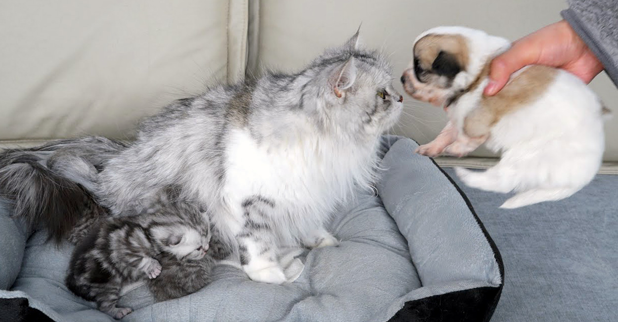 ある日、母犬に置き去りにされてしまった子犬が、子育て中の母猫が暮らしている家にやって来ました。子犬が独りぼっちで可哀想に思った住人は、子犬を母猫のところに連れていきました。
