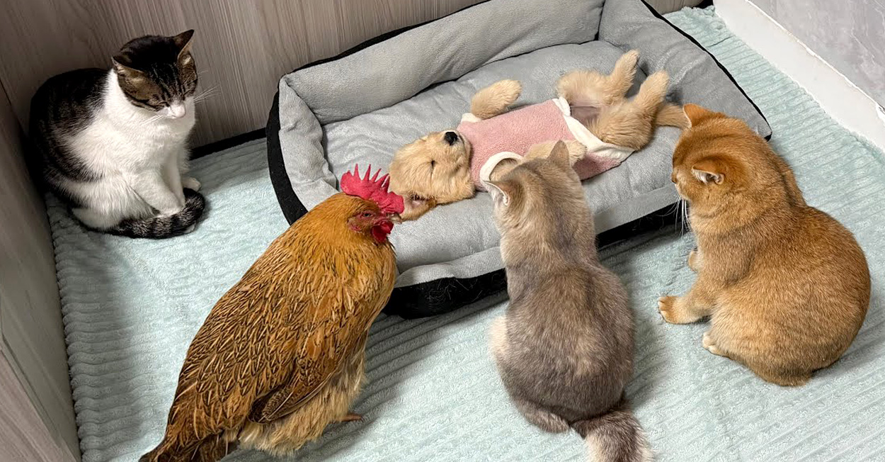病気の子犬を世話するニワトリと猫達の様子はこちら。