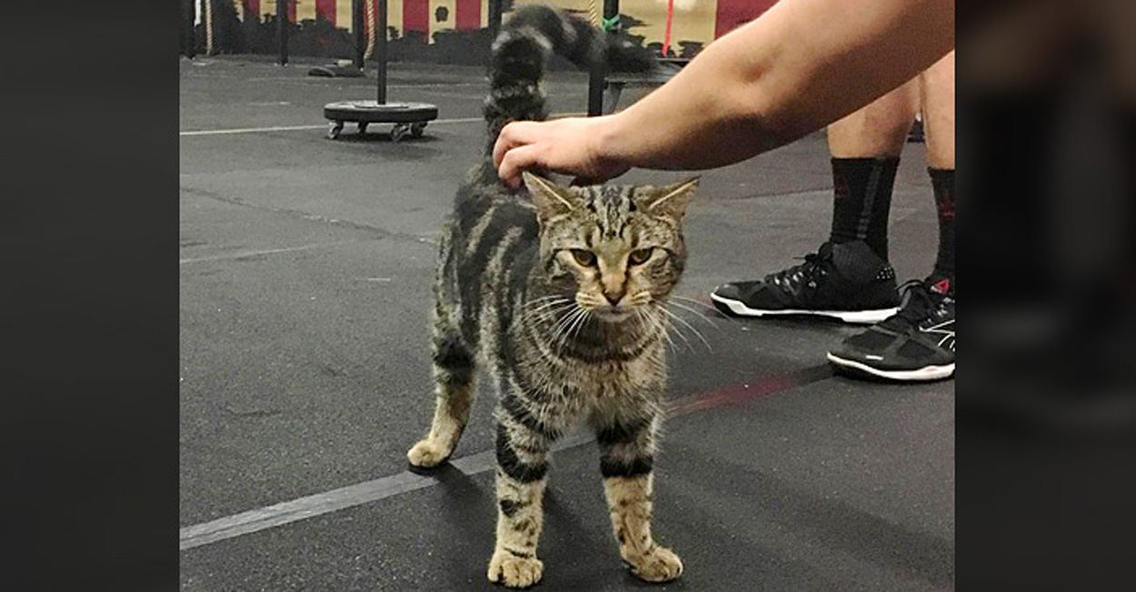 ある日、スポーツジムで地元の人達がトレーニングをしていると、キジトラの野良猫がジムの中に入ってきました。