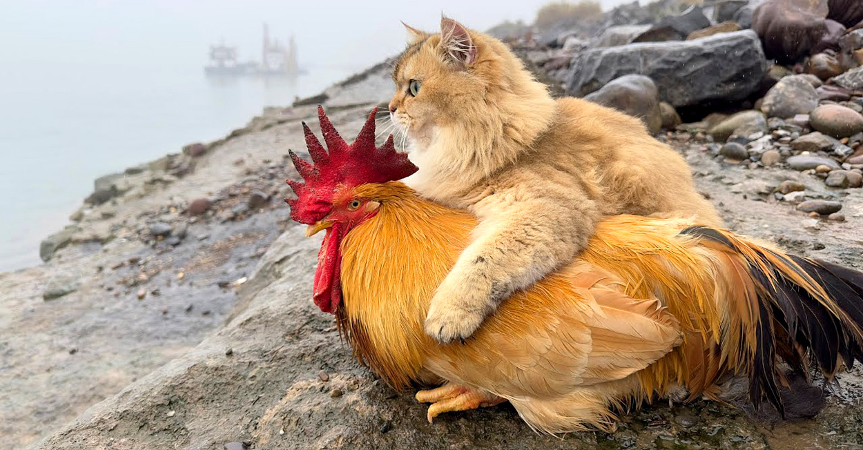 ある日、仲良しなニワトリを連れて散歩に出かけた猫。ニワトリのことを常に気に掛けながら、河原まで一緒に歩いていきました。