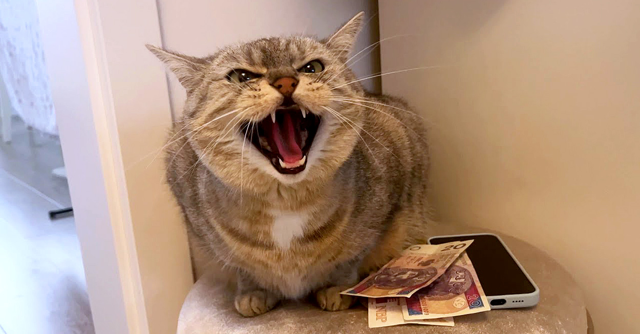 その後、サバトラ猫の『ルーシー』が番猫を代わって、お金を真剣な表情で守り始めました。そして飼い主さんがルーシーの懐からお金を取ろうとすると、物凄い剣幕で「シャー!」と威嚇してきました!