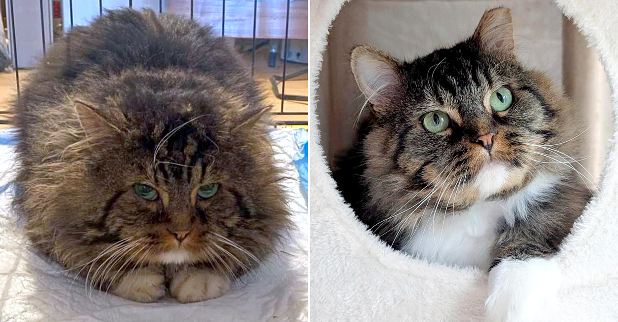 『イウォーク』と名付けられたオス猫が住人によって保護されると、少し緊張している様子を見せましたが、攻撃したりすることはありませんでした。その後、家の中で暖かいベッドとたくさんのご飯をもらったイウォークは、安堵の表情を浮かべました。この時のイウォークの毛はひどく絡まっていて、背中には他の動物に引っ掻かれてできた傷がありました。