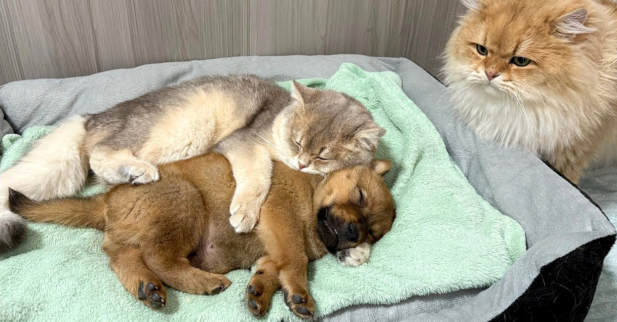 愛情いっぱいの猫達のおかげで子犬もすっかり安心しているようです♡