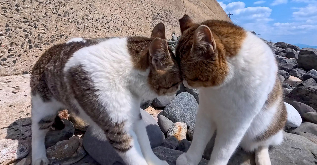 ある晴れた日に男性が海岸を歩いていると、額が当たるくらい顔を近づけて怒鳴り合う猫達の姿を発見しました!
