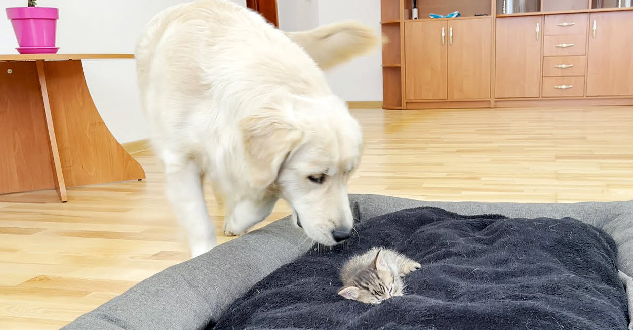 ある日、ゴールデンレトリバーが自分のベッドに戻ってくると、子猫にベッドを占領されていました!
