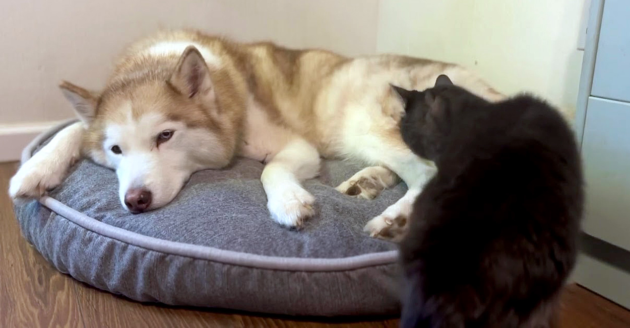 お互いに12歳で、寄り添いながら過ごすのが大好きな猫の『ファリーナ』とシベリアンハスキーの『メイビー』。この日、暴風雨でちょっと心細くなったファリーナが、自分の気持ちを落ち着かせるために、ベッドで横になっているメイビーの元に向かいました。