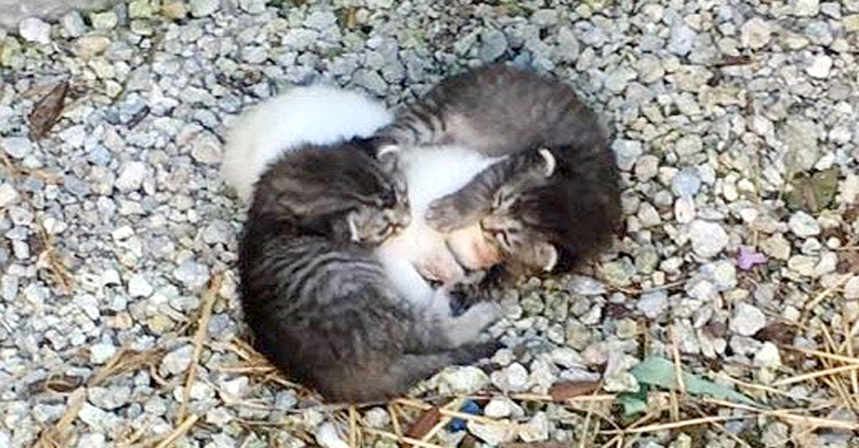 ある日、ミーガンさんが買い物のために外出すると、砂利道で丸くなっている3匹の子猫達の姿を発見しました。ミーガンさんが子猫達をよく見ると、真ん中の白猫が小刻みに震えていて、2匹のキジトラ猫が白猫のことを守っていました。