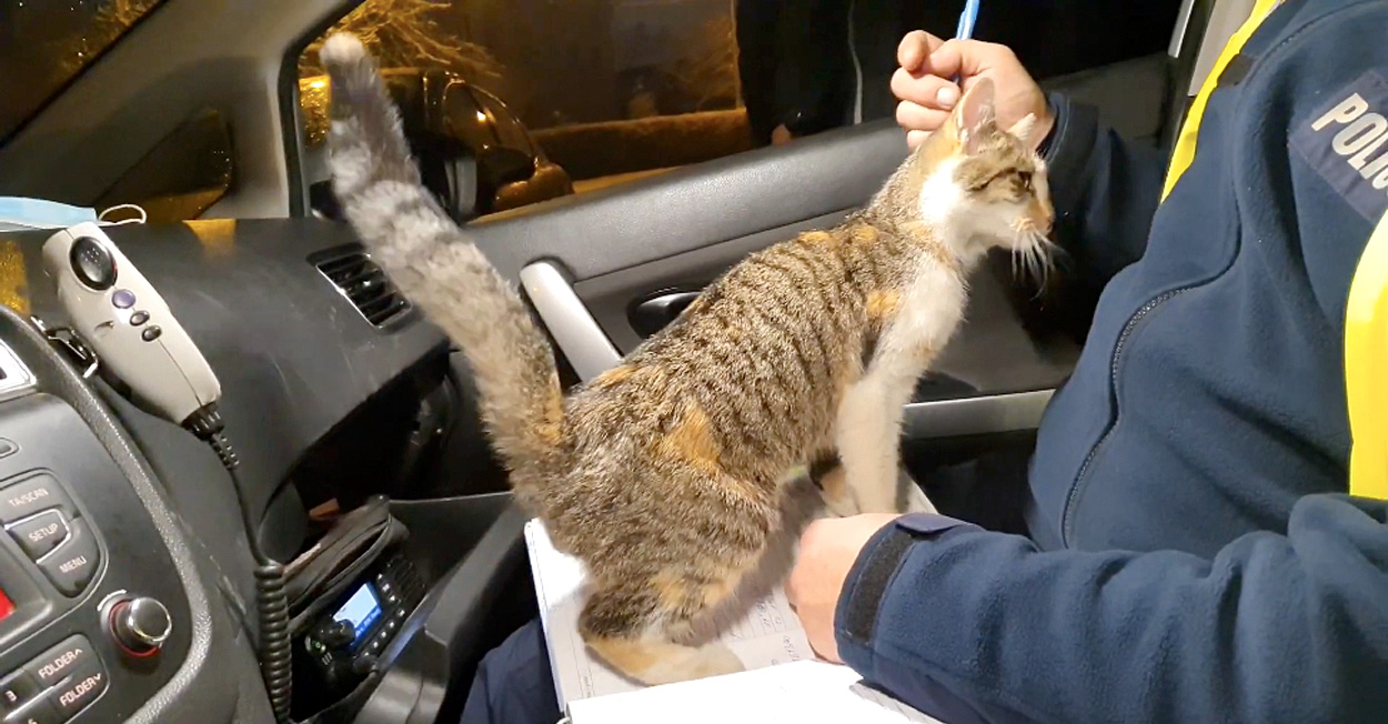 「猫は警察官に作業をさせないようにしてきました。猫は首輪をつけていませんでしたが、とっても社交的な性格で、人間のハグが大好きでした」とシロンスカ警察署がSNSに書き込みました。