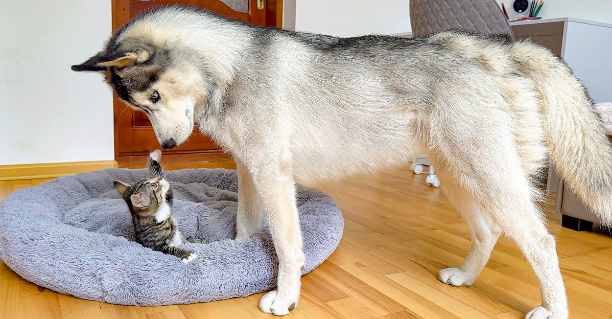 ある日、ハスキー犬が自分のベッドに戻ってくると、小ない子猫がベッドを占領していてビックリ!