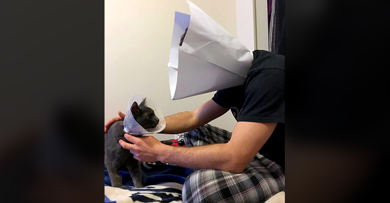 それから約30秒後、男性は自分用のエリザベスカラーを作り上げました!