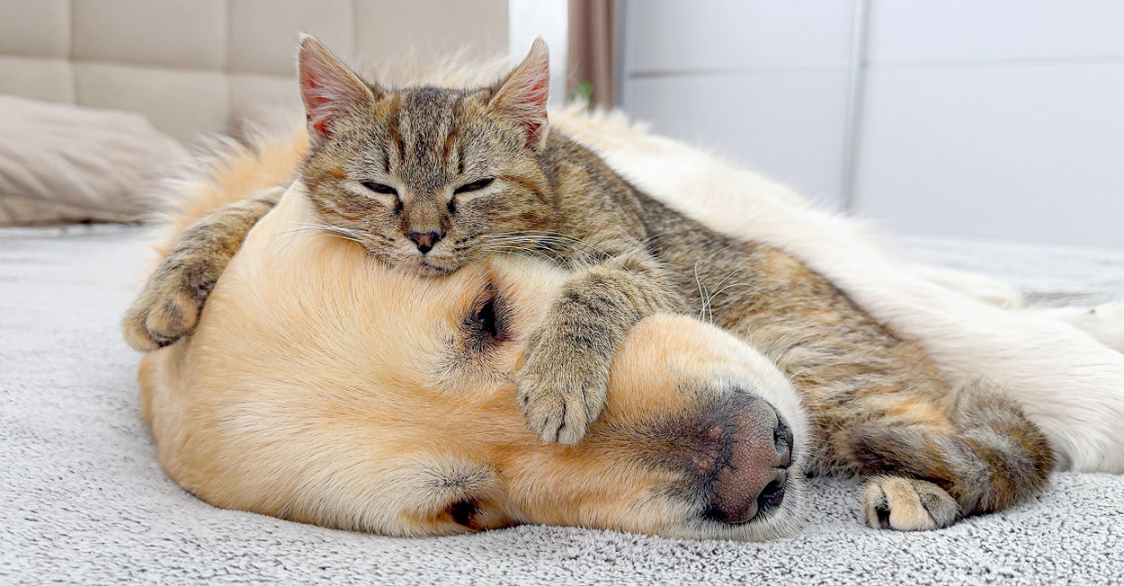 ある日、リラックスするために飼い主さんのベッドにやって来たゴールデンレトリバー。そこには子猫が先に来ていて、ひとりでまったりとしていました♪