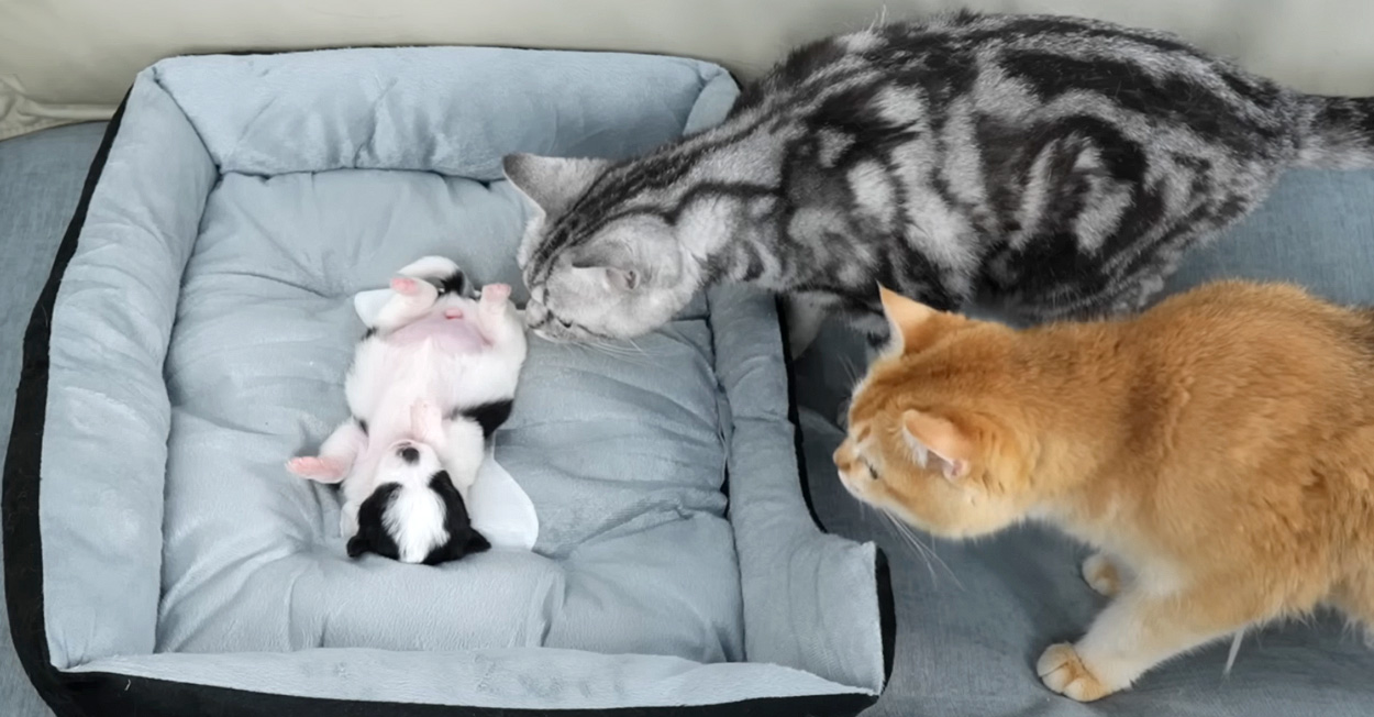 そんな子犬はこの日、ベッドの中で無防備なヘソ天姿で眠っていました。すると猫達が「子犬が死んでしまったのではないか」と心配そうに様子をうかがいにやって来ました。