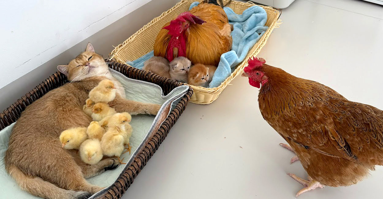そこにめんどりがやって来ると、種族の垣根を超えて愛情を注ぐおんどりと母猫の姿に驚きました!