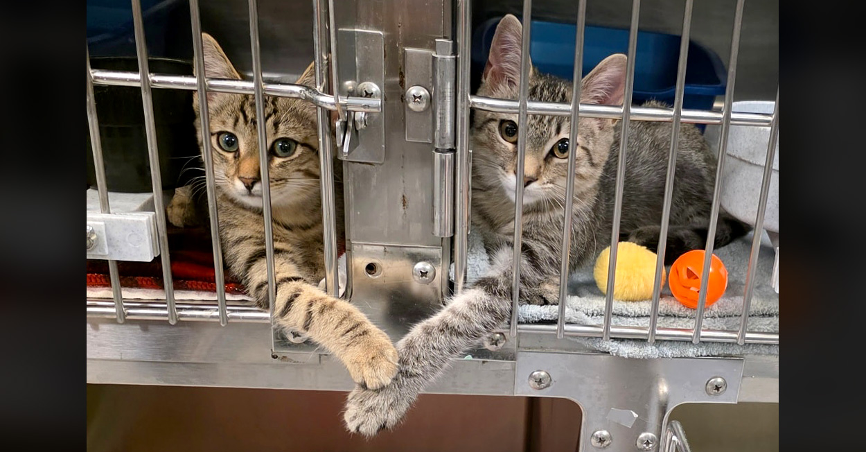2匹の子猫がケージ越しに手を繋いでいるのを保護施設のスタッフが発見! その愛らしいふたりの姿に一瞬で心が溶かされる