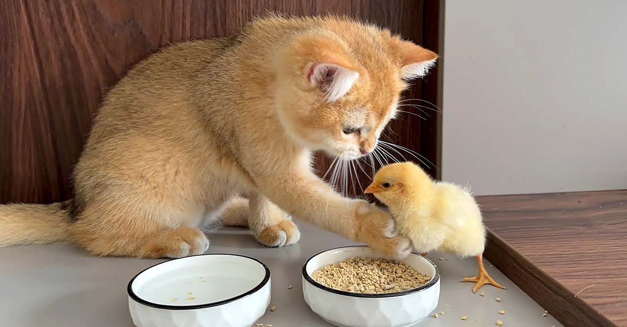 ヒヨコを自宅に連れて帰って育てる子猫。ヒヨコに食事のマナーを教える様子がとっても可愛い (*´ω`*)♡