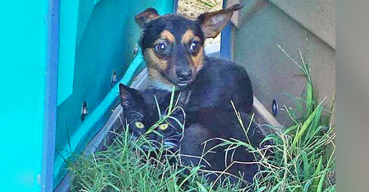 ある日、アメリカのハンプトンにあるサッカー・パークを歩いていた通行人が、建物の脇の茂みの中にいる犬の姿を発見しました。そしてその犬には、1匹の子猫がピッタリと寄り添っていました。